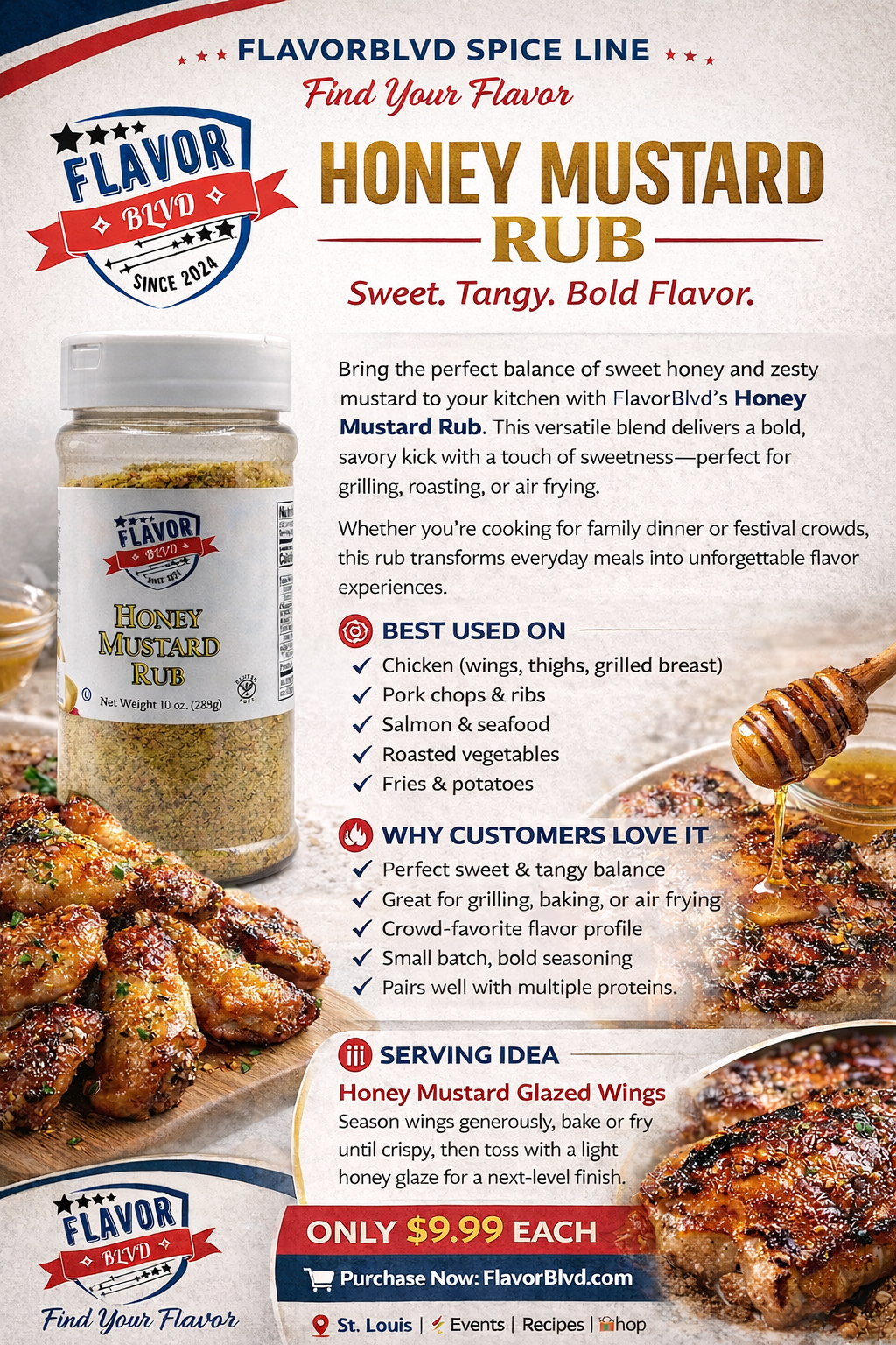 Honey Mustard Rub is a sweet and tangy blend with a touch of garlic for a flavor boost. This rub is perfect for chicken, pork, and even fish and vegetables. Whether you’re grilling, roasting, or baking, our Honey Mustard Rub will add a burst of sweet and savory goodness to your meal.