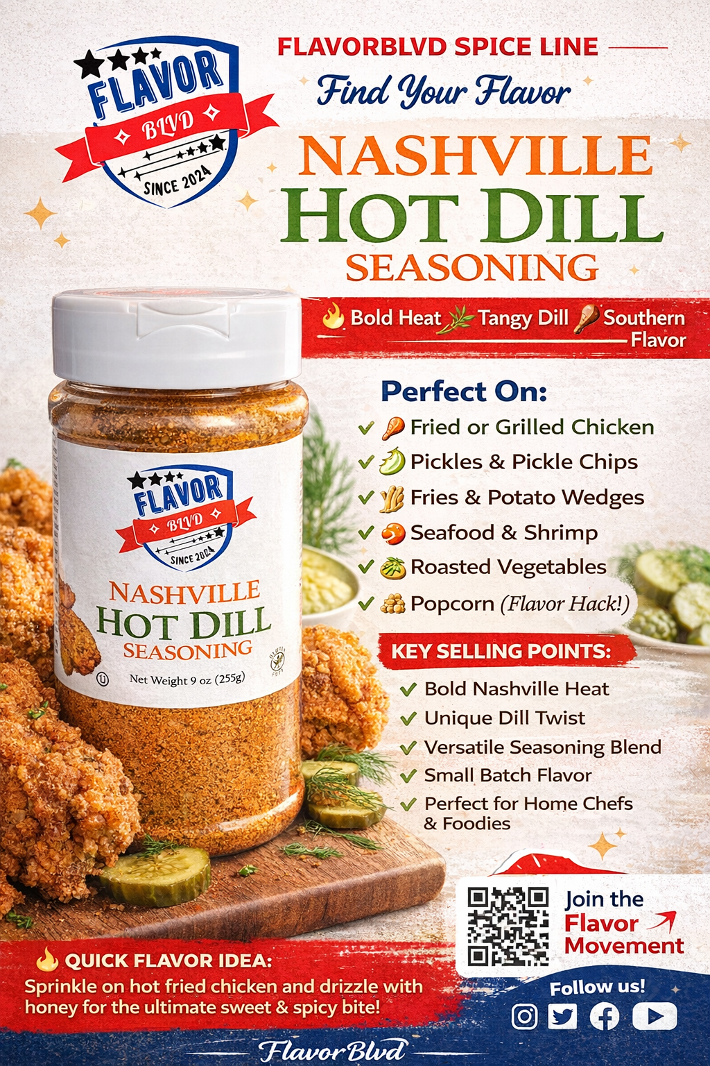 Turn up the flavor with FlavorBlvd’s Nashville Hot Dill Seasoning—a bold fusion of fiery heat and tangy dill that brings Southern-inspired flavor to every bite. This unique blend combines the signature spice of Nashville hot seasoning with the fresh, zesty kick of dill for a perfectly balanced taste that’s both savory and unforgettable.