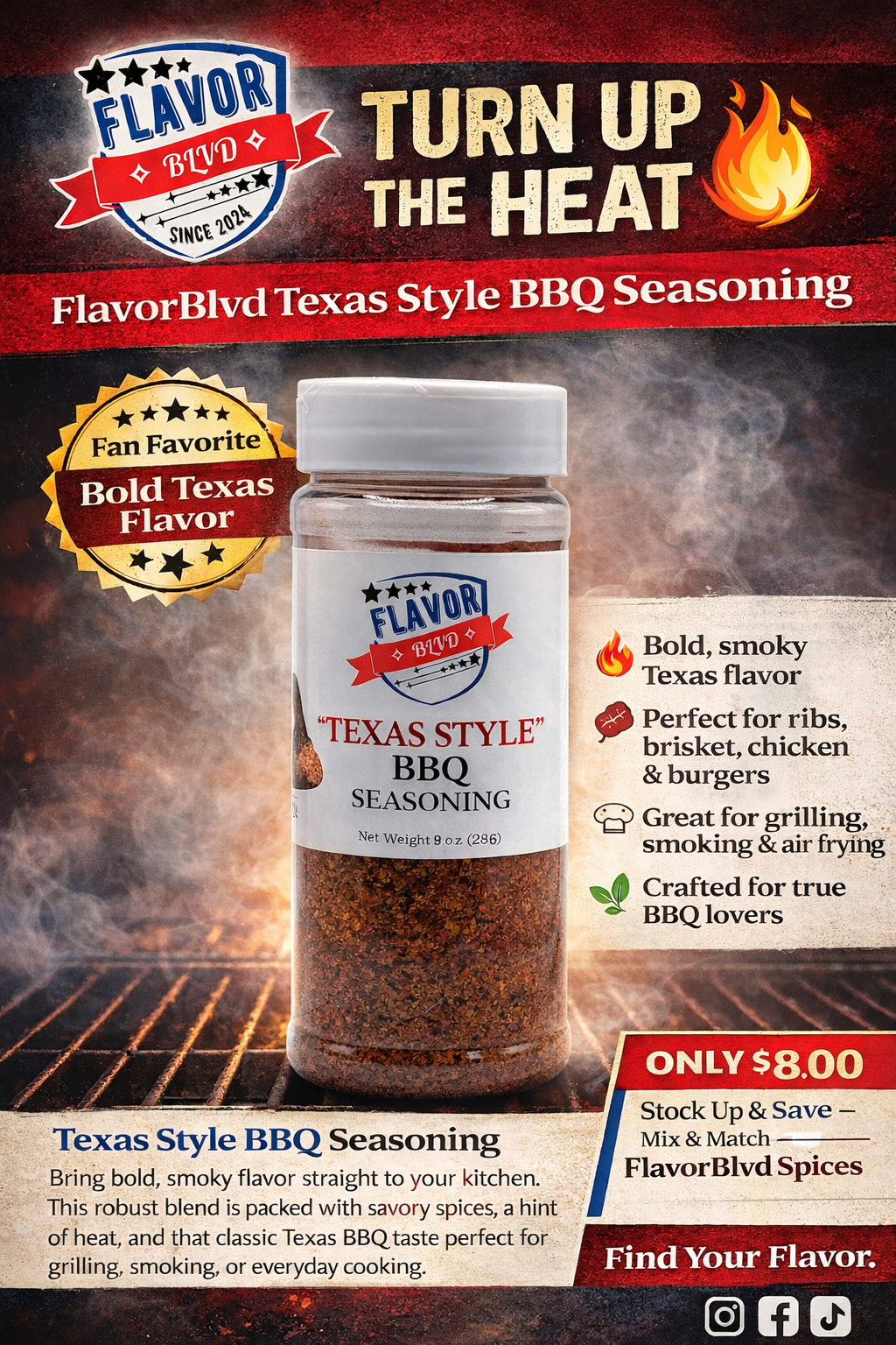 Bring bold, smoky flavor straight from the heart of Texas to your kitchen. FlavorBlvd’s Texas Style BBQ Seasoning is a rich, savory blend crafted to deliver that authentic pitmaster taste with every bite. Featuring a perfect balance of smoky spices, subtle heat, and deep, robust flavor, this seasoning is your go-to for creating mouthwatering BBQ at home.